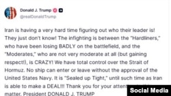 Սպիտակ տան ղեկավարը պնդել է նաև, թե Իրանը դժվարանում է առաջնորդ ընտրել, և որ Թեհրանում առկա են քաղաքական հակասություններ «կոշտ դիրքորոշում ունեցողների» և «չափավորների» միջև, որոնք, ըստ նախագահի՝ «իրականում այդքան էլ չափավոր չեն»։