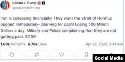 «Նրանք ցանկանում են, որ Հորմուզի նեղուցն անմիջապես բացվի: Նրանք օրական կորցնում են 500 միլիոն դոլար», - Truth Social-ում գրել է Թրամփը՝ հավելելով, որ Իսլամական Հանրապետությունը «փողի լուրջ պակաս ունի»։