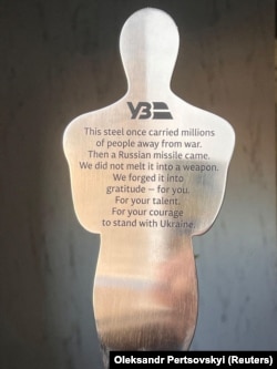 Տեսանյութում նշվում է, որ արձանիկի նյութը ստացվել է ռուսական հարվածից վնասված գնացքի մի հատվածից։