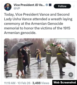 Վենսի աշխատակազմից հայտնում են՝ առաջին գրառումը սխալմամբ է տեղադրվել անձնակազմի կողմից, նրանք փոխնախագահի գլխավորած պատվիրակությունում չեն եղել։ Խոսնակն էլ բացատրել է՝ փոխնախագահի տեսակետին կարող եք ծանոթանալ ինքնաթիռի մոտ նրա արած մեկնաբանությամբ։ Ինքնաթիռի մոտ Ջեյ Դի Վենսն այսօր Հայոց ցեղասպանությունը «շատ սարսափելի բան» անվանեց։ Թրամփի վարչակազմը հավատարիմ է Հայոց ցեղասպանության փոխարեն այլ արտահայտություններ օգտագործելու քաղաքականությանը։ Անցած տարի էլ նախագահ Դոնալդ Թրամփի ապրիլքսանչորսյան ուղերձում «Մեծ Եղեռն» հնչեց։